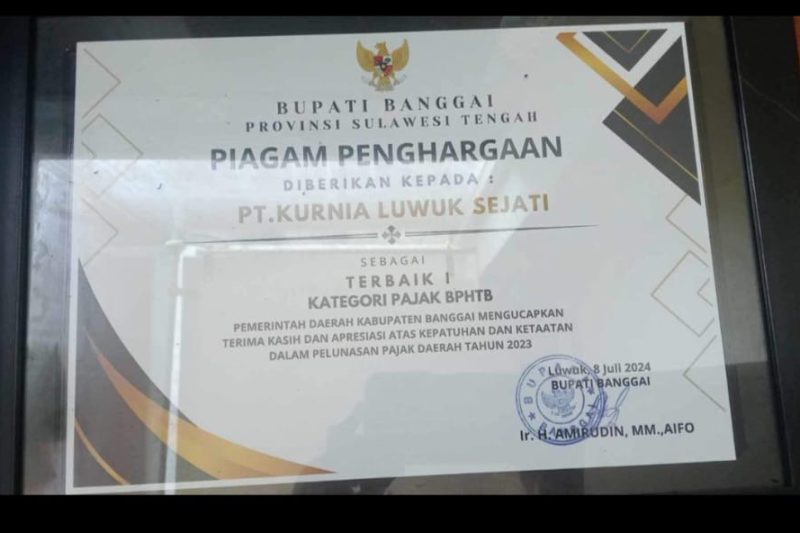 Penghargaan kepada perusahaan yang dipimpin Hj. Sulianti Murad ini ditandatangani oleh Bupati Banggai pada 8 Juli 2024. Dalam lembaran penghargaan tersebut, Bupati mengucapkan terima kasih dan apresiasi kepada PT KLS atas kepatuhan dan ketaatan dalam pelunasan Pajak Daerah tahun 2023.