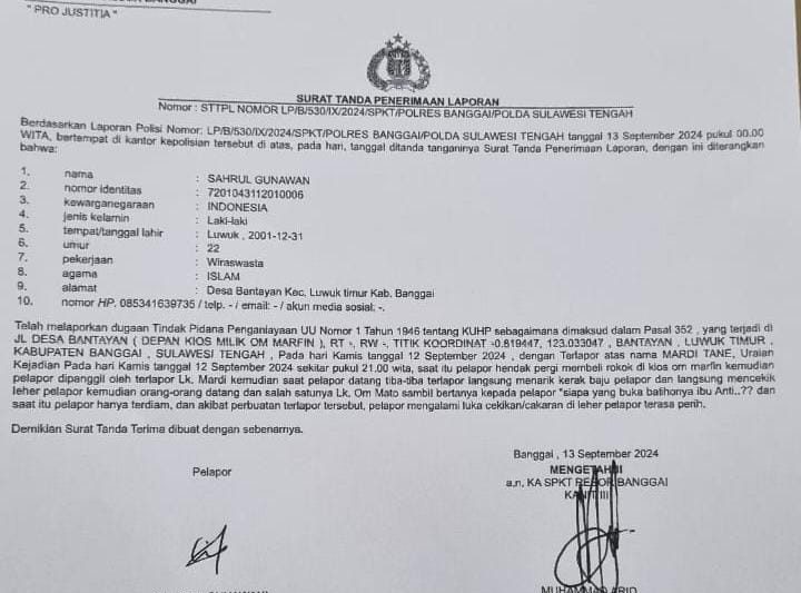 Atas kejadian tersebut, SG segera melaporkan tindakan pelaku ke SPKT Polres Banggai. Laporan SG telah diterima dengan Nomor STTPL LP/B/530/IX/2024. “Saya berharap, laporan ini bisa menyadarkan pendukung atau relawan bu Anti untuk tidak memaksakan kehendak mereka kepada warga lain, apalagi dengan tindakan kekerasan,” jelas SG.